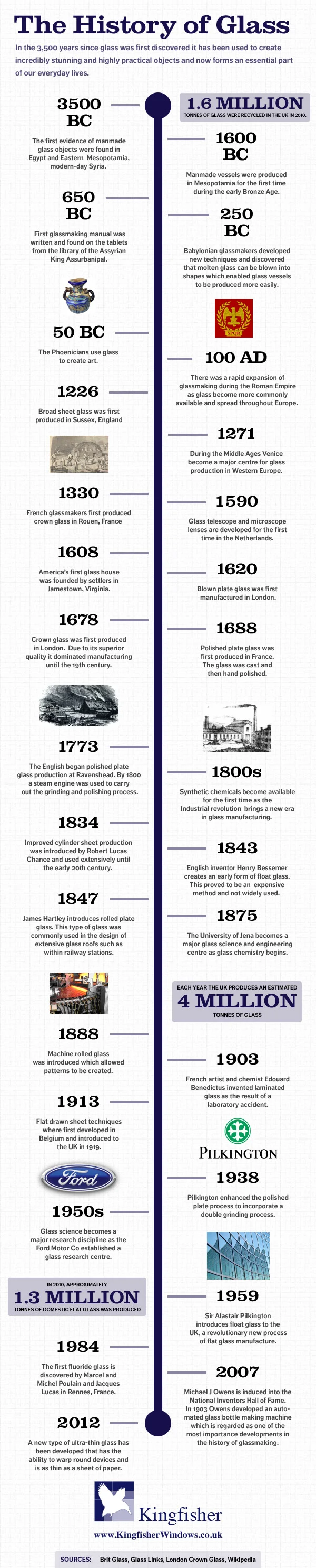 The history of glass stretches back over 3,500 years, spanning the globe and embracing different cultures along the way. Today glass serves so many essential functions that a world without it is hard to imagine but how did it evolve from the early glass objects of the Bronze Age to the highly advanced and multifunctional material we know today?